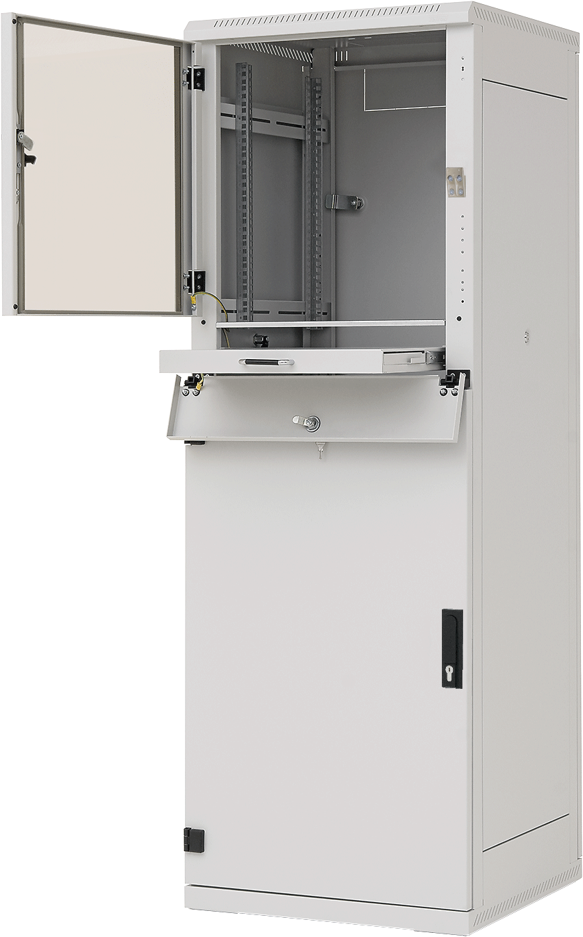 Szafa do zastosowań przemysłowych – oddzielne sekcje, odpowiednia do instalacji komputerowych, posiada perforowaną górną i dolną część, otwory na przejścia kablowe oraz miejsce na montaż wentylatora.